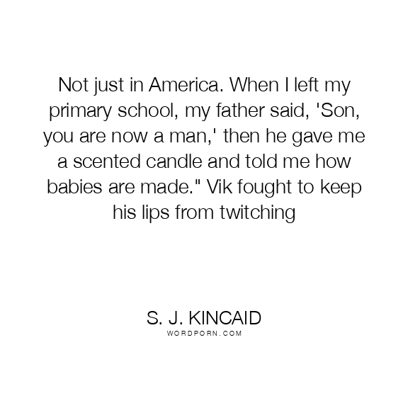 Not just in America. When I left my primary school, my father said, 'Son, you are now a man,' then he gave me a scented candle and told me how babies are made." Vik fought to keep his lips from twitching