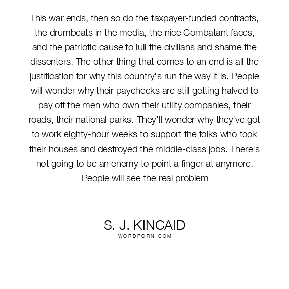 This war ends, then so do the taxpayer-funded contracts, the drumbeats in the media, the nice Combatant faces, and the patriotic cause to lull the civilians and shame the dissenters. The other thing that comes to an end is all the justification for why this country's run the way it is. People will wonder why their paychecks are still getting halved to pay off the men who own their utility companies, their roads, their national parks. They'll wonder why they've got to work eighty-hour weeks to support the folks who took their houses and destroyed the middle-class jobs. There's not going to be an enemy to point a finger at anymore. People will see the real problem