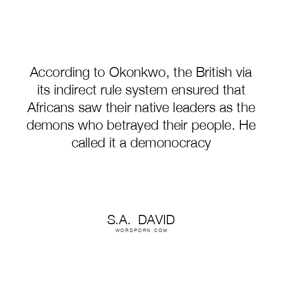 According to Okonkwo, the British via its indirect rule system ensured that Africans saw their native leaders as the demons who betrayed their people. He called it a demonocracy
