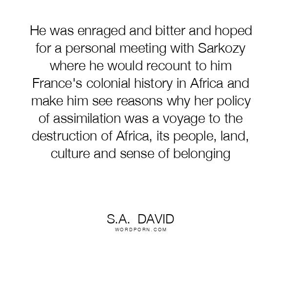 He was enraged and bitter and hoped for a personal meeting with Sarkozy where he would recount to him France's colonial history in Africa and make him see reasons why her policy of assimilation was a voyage to the destruction of Africa, its people, land, culture and sense of belonging