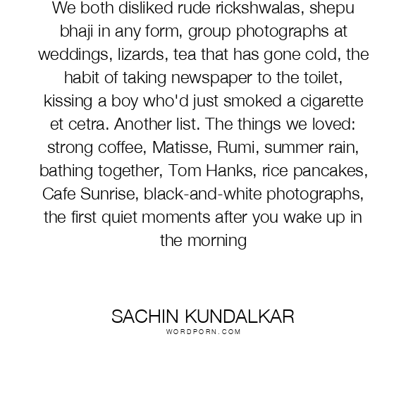 We both disliked rude rickshwalas, shepu bhaji in any form, group photographs at weddings, lizards, tea that has gone cold, the habit of taking newspaper to the toilet, kissing a boy who'd just smoked a cigarette et cetra. Another list. The things we loved: strong coffee, Matisse, Rumi, summer rain, bathing together, Tom Hanks, rice pancakes, Cafe Sunrise, black-and-white photographs, the first quiet moments after you wake up in the morning