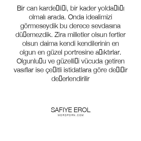 Bir can kardeşliği, bir kader yoldaşlığı olmalı arada. Onda idealimizi görmeseydik bu derece sevdasına düşemezdik. Zira milletler olsun fertler olsun daima kendi kendilerinin en olgun en güzel portresine aşıktırlar. Olgunluğu ve güzelliği vücuda getiren vasıflar ise çeşitli istidatlara göre değişir değerlendirilir