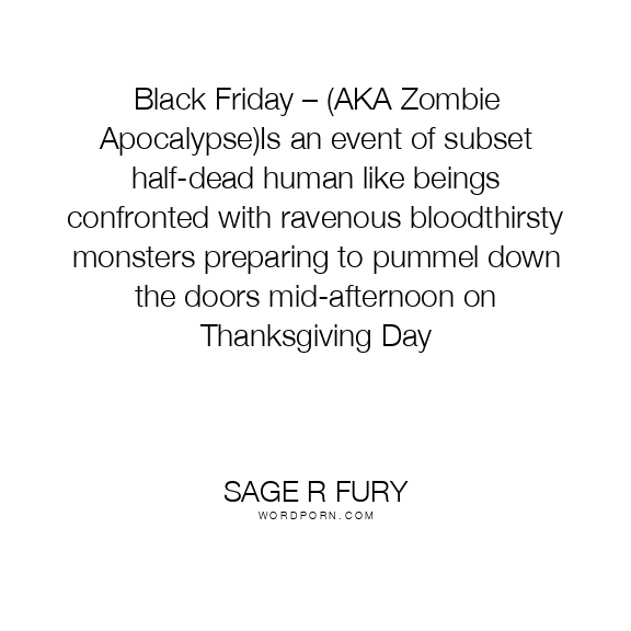 Black Friday – (AKA Zombie Apocalypse)Is an event of subset half-dead human like beings confronted with ravenous bloodthirsty monsters preparing to pummel down the doors mid-afternoon on Thanksgiving Day