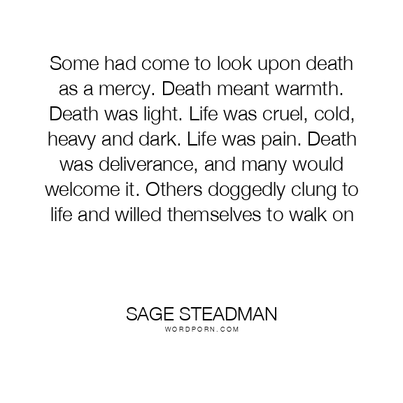 Some had come to look upon death as a mercy. Death meant warmth. Death was light. Life was cruel, cold, heavy and dark. Life was pain. Death was deliverance, and many would welcome it. Others doggedly clung to life and willed themselves to walk on