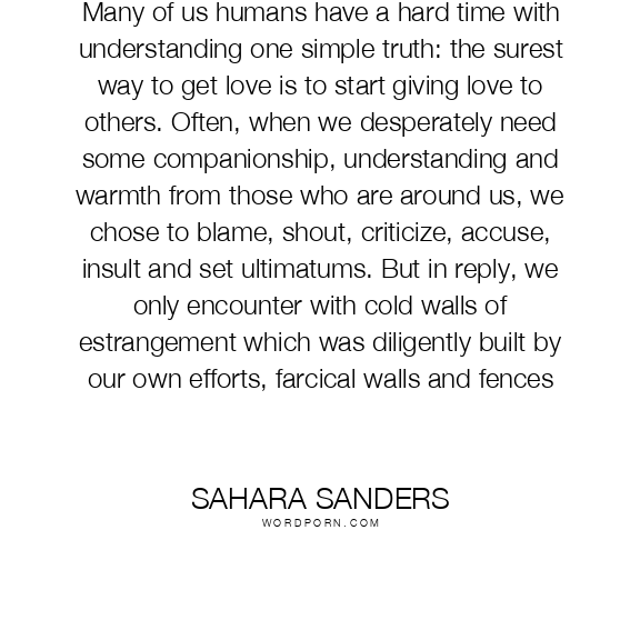 Many of us humans have a hard time with understanding one simple truth: the surest way to get love is to start giving love to others. Often, when we desperately need some companionship, understanding and warmth from those who are around us, we chose to blame, shout, criticize, accuse, insult and set ultimatums. But in reply, we only encounter with cold walls of estrangement which was diligently built by our own efforts, farcical walls and fences
