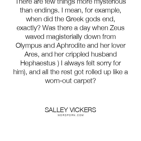 There are few things more mysterious than endings. I mean, for example, when did the Greek gods end, exactly? Was there a day when Zeus waved magisterially down from Olympus and Aphrodite and her lover Ares, and her crippled husband Hephaestus ) I always felt sorry for him), and all the rest got rolled up like a worn-out carpet?