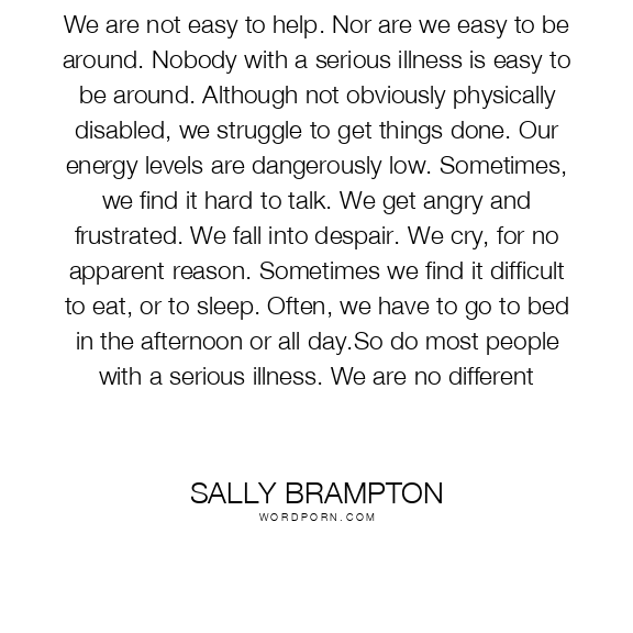 We are not easy to help. Nor are we easy to be around. Nobody with a serious illness is easy to be around. Although not obviously physically disabled, we struggle to get things done. Our energy levels are dangerously low. Sometimes, we find it hard to talk. We get angry and frustrated. We fall into despair. We cry, for no apparent reason. Sometimes we find it difficult to eat, or to sleep. Often, we have to go to bed in the afternoon or all day.So do most people with a serious illness. We are no different