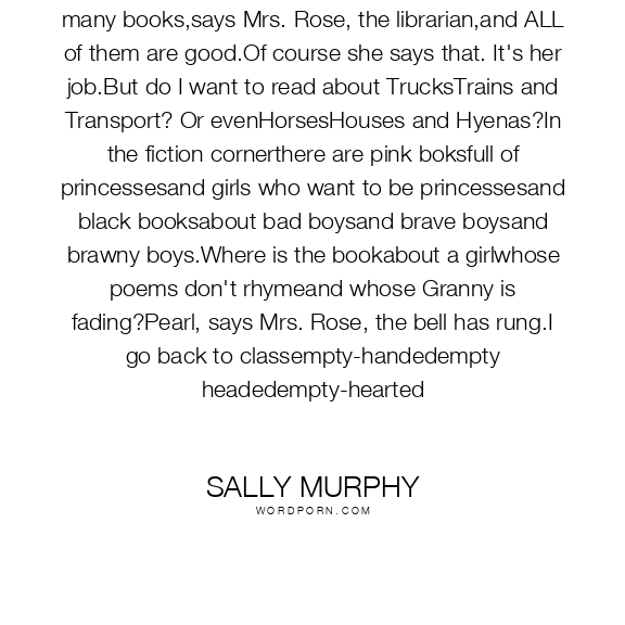 In the libraryI search for a good book.We have many books,says Mrs. Rose, the librarian,and ALL of them are good.Of course she says that. It's her job.But do I want to read about TrucksTrains and Transport? Or evenHorsesHouses and Hyenas?In the fiction cornerthere are pink boksfull of princessesand girls who want to be princessesand black booksabout bad boysand brave boysand brawny boys.Where is the bookabout a girlwhose poems don't rhymeand whose Granny is fading?Pearl, says Mrs. Rose, the bell has rung.I go back to classempty-handedempty headedempty-hearted