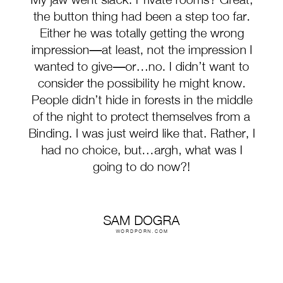 My jaw went slack. Private rooms? Great, the button thing had been a step too far. Either he was totally getting the wrong impression—at least, not the impression I wanted to give—or…no. I didn’t want to consider the possibility he might know. People didn’t hide in forests in the middle of the night to protect themselves from a Binding. I was just weird like that. Rather, I had no choice, but…argh, what was I going to do now?!