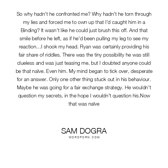 So why hadn’t he confronted me? Why hadn’t he torn through my lies and forced me to own up that I’d caught him in a Binding? It wasn’t like he could just brush this off. And that smile before he left, as if he’d been pulling my leg to see my reaction…I shook my head. Ryan was certainly providing his fair share of riddles. There was the tiny possibility he was still clueless and was just teasing me, but I doubted anyone could be that naïve. Even him. My mind began to tick over, desperate for an answer. Only one other thing stuck out in his behaviour. Maybe he was going for a fair exchange strategy. He wouldn’t question my secrets, in the hope I wouldn’t question his.Now that was naïve