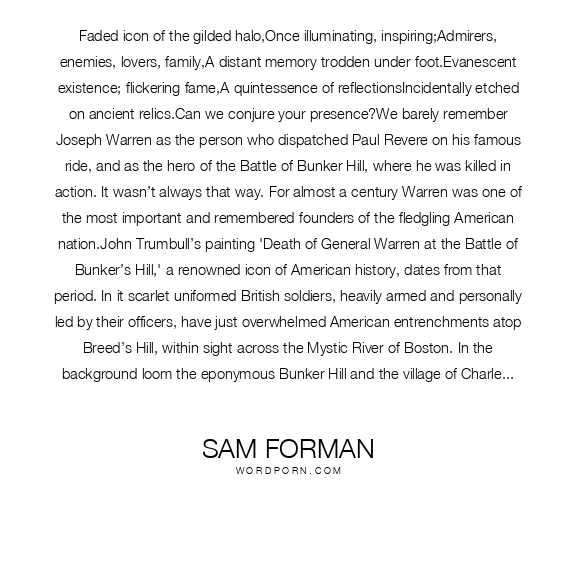 Faded icon of the gilded halo,Once illuminating, inspiring;Admirers, enemies, lovers, family,A distant memory trodden under foot.Evanescent existence; flickering fame,A quintessence of reflectionsIncidentally etched on ancient relics.Can we conjure your presence?We barely remember Joseph Warren as the person who dispatched Paul Revere on his famous ride, and as the hero of the Battle of Bunker Hill, where he was killed in action. It wasn’t always that way. For almost a century Warren was one of the most important and remembered founders of the fledgling American nation.John Trumbull’s painting 'Death of General Warren at the Battle of Bunker’s Hill,' a renowned icon of American history, dates from that period. In it scarlet uniformed British soldiers, heavily armed and personally led by their officers, have just overwhelmed American entrenchments atop Breed’s Hill, within sight across the Mystic River of Boston. In the background loom the eponymous Bunker Hill and the village of Charlestown, its houses and churches aflame, a smoky cloud framing the battlefield. The Americans, a motley amalgam of raw militia, countrymen and workers, try unsuccessfully to fend off the onslaught.New England’s Pine Tree flag still stands within the American dirt fort in the unseasonably hot and breezeless early summer afternoon. The red coated attackers, brandishing the colors of the United Kingdom, will take it down in a moment. It is June 17, 1775: The defenders of an embryonic American Liberty are about to be defeated in a British Pyrrhic victory.In the forefront, Colonel William Prescott commands the Americans while rotund General Israel Putnam vainly shouts orders in the background. British Generals Burgoyne and Clinton command the British attackers as Major John Pitcairn, leader of the marines falters, mortally wounded, yet still supported by a soldier. British and Americans have fallen indiscriminately on the field among the detritus of battle.In the foreground, a finely dressed figure lies prostrate, his sword dropped to the earth. Prescott wards off a bayonet thrust by an onrushing British infantryman. It is a thrust the enemy’s own superior officer, Colonel Small, curiously appears to want deflected. But the targeted figure already lies supine, looking skyward in a saintly blank stare. He is suspended momentarily in a halo of tranquility amongst the mayhem.This dying man can no longer smell the acrid, dense black powder smoke that hangs low in the windless oppressive heat, obscuring the afternoon sun. He pays no heed to the shouts of men nor the eerie lull in the previously deafening gunfire. The animation, his admonishments of others to action, the thrill and fear of battle, all suddenly calm. A single bullet annihilates in an instant inspiring words, the force of personality, the martial spirit in action, the reality and complexity of a human being.Dr. Joseph Warren, the central figure, moves from life to legend.Trumbull’s iconic painting raises unanswered questions about its subject. How did a physician come to assume such a responsible role in this engagement? How did he meet his fate within sight of his home town? Why was he famous throughout the young United States as a model for involved citizenship? Was there any truth to the cynicism of his political enemies? Most compelling of all-why has this once beloved leader been so long and unjustifiably forgotten?This biography of Joseph Warren answers these and other questions. It utilizes modern analytical methods, uncovers new material, and sheds new light on “established