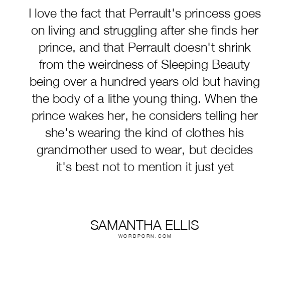 I love the fact that Perrault's princess goes on living and struggling after she finds her prince, and that Perrault doesn't shrink from the weirdness of Sleeping Beauty being over a hundred years old but having the body of a lithe young thing. When the prince wakes her, he considers telling her she's wearing the kind of clothes his grandmother used to wear, but decides it's best not to mention it just yet