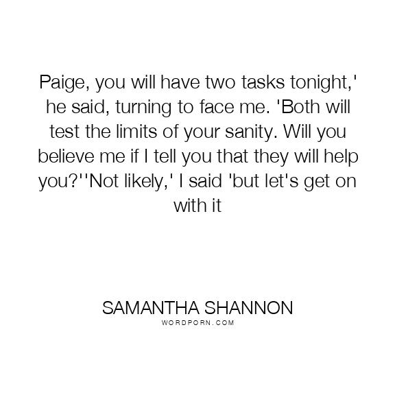 Paige, you will have two tasks tonight,' he said, turning to face me. 'Both will test the limits of your sanity. Will you believe me if I tell you that they will help you?''Not likely,' I said 'but let's get on with it