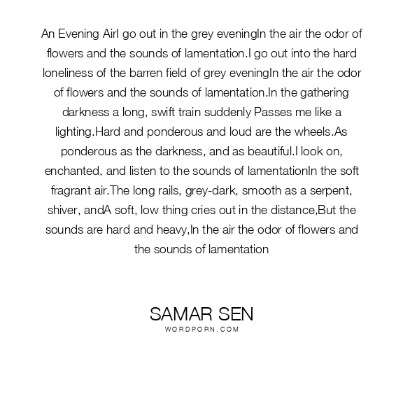 An Evening AirI go out in the grey eveningIn the air the odor of flowers and the sounds of lamentation.I go out into the hard loneliness of the barren field of grey eveningIn the air the odor of flowers and the sounds of lamentation.In the gathering darkness a long, swift train suddenly Passes me like a lighting.Hard and ponderous and loud are the wheels.As ponderous as the darkness, and as beautiful.I look on, enchanted, and listen to the sounds of lamentationIn the soft fragrant air.The long rails, grey-dark, smooth as a serpent, shiver, andA soft, low thing cries out in the distance,But the sounds are hard and heavy,In the air the odor of flowers and the sounds of lamentation