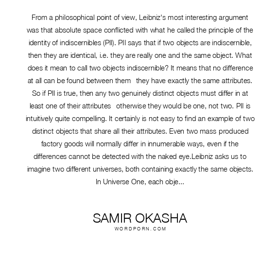 From a philosophical point of view, Leibniz's most interesting argument was that absolute space conflicted with what he called the principle of the identity of indiscernibles (PII). PII says that if two objects are indiscernible, then they are identical, i.e. they are really one and the same object. What does it mean to call two objects indiscernible? It means that no difference at all can be found between them--they have exactly the same attributes. So if PII is true, then any two genuinely distinct objects must differ in at least one of their attributes--otherwise they would be one, not two. PII is intuitively quite compelling. It certainly is not easy to find an example of two distinct objects that share all their attributes. Even two mass-produced factory goods will normally differ in innumerable ways, even if the differences cannot be detected with the naked eye.Leibniz asks us to imagine two different universes, both containing exactly the same objects. In Universe One, each object occupies a particular location in absolute space.In Universe Two, each object has been shifted to a different location in absolute space, two miles to the east (for example). There would be no way of telling these two universes apart. For we cannot observe the position of an object in absolute space, as Newton himself admitted. All we can observe are the positions of objects relative to each other, and these would remain unchanged--for all objects are shifted by the same amount. No observations or experiments could ever reveal whether we lived in universe One or Two