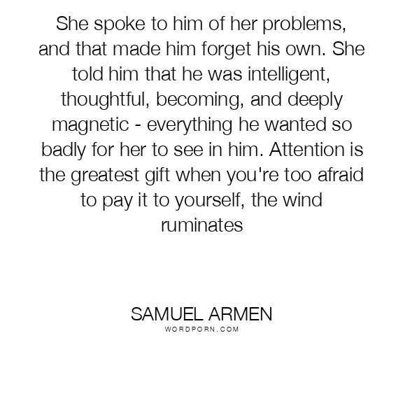 She spoke to him of her problems, and that made him forget his own. She told him that he was intelligent, thoughtful, becoming, and deeply magnetic - everything he wanted so badly for her to see in him. Attention is the greatest gift when you're too afraid to pay it to yourself, the wind ruminates