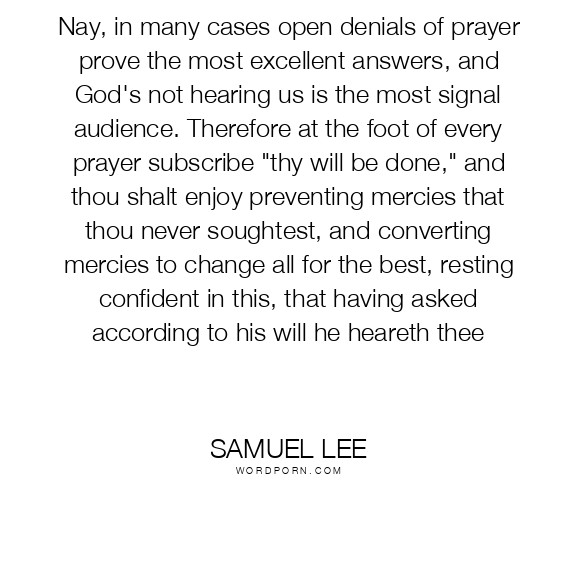 Nay, in many cases open denials of prayer prove the most excellent answers, and God's not hearing us is the most signal audience. Therefore at the foot of every prayer subscribe "thy will be done," and thou shalt enjoy preventing mercies that thou never soughtest, and converting mercies to change all for the best, resting confident in this, that having asked according to his will he heareth thee