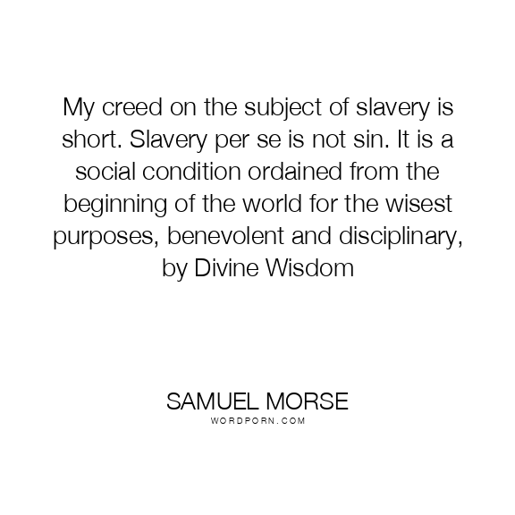 My creed on the subject of slavery is short. Slavery per se is not sin. It is a social condition ordained from the beginning of the world for the wisest purposes, benevolent and disciplinary, by Divine Wisdom