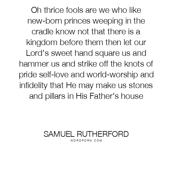 Samuel Rutherford quote. Oh thrice fools are we who like new-born princes weeping in the cradle know not that there is a kingdom before them then let our Lord's sweet hand square us and hammer us and strike off the knots of pride self-love and world-worship and infidelity that He may make us stones and pillars in His Father's house