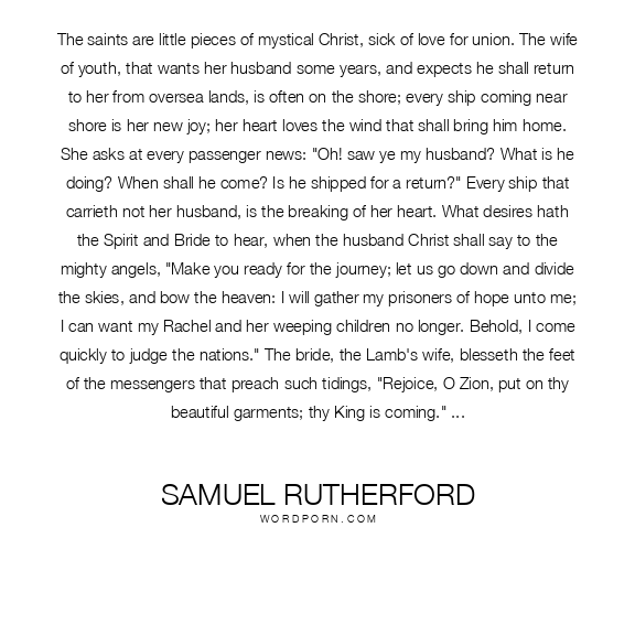 Samuel Rutherford quote. The saints are little pieces of mystical Christ, sick of love for union. The wife of youth, that wants her husband some years, and expects he shall return to her from oversea lands, is often on the shore; every ship coming near shore is her new joy; her heart loves the wind that shall bring him home. She asks at every passenger news: