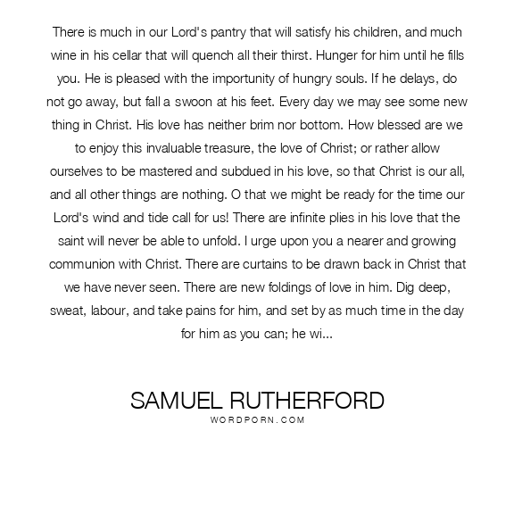 Samuel Rutherford quote. There is much in our Lord's pantry that will satisfy his children, and much wine in his cellar that will quench all their thirst. Hunger for him until he fills you. He is pleased with the importunity of hungry souls. If he delays, do not go away, but fall a-swoon at his feet. Every day we may see some new thing in Christ. His love has neither brim nor bottom. How blessed are we to enjoy this invaluable treasure, the love of Christ; or rather allow ourselves to be mastered and subdued in his love, so that Christ is our all, and all other things are nothing. O that we might be ready for the time our Lord's wind and tide call for us! There are infinite plies in his love that the saint will never be able to unfold. I urge upon you a nearer and growing communion with Christ. There are curtains to be drawn back in Christ that we have never seen. There are new foldings of love in him. Dig deep, sweat, labour, and take pains for him, and set by as much time in the day for him as you can; he will be won with labour. Live on Christ's love. Christ's love is so kingly, that it will not wait until tomorrow, it must have a throne all alone in your soul. It is our folly to divide our narrow and little love. It is best to give it all to Christ. Lay no more on the earthly, than it can carry. Lay your soul and your weights upon God; make him your only and best-beloved. Your errand in this life is to make sure an eternity of glory for your soul, and to match your soul with Christ. Your love, if it could be more than all the love of angels in one, would be Christ's due. Look up to him and love him. O, love and live! My counsel is, that you come out and leave the multitude, and let Christ have your company. Let those who love this present world have it, but Christ is a more worthy and noble portion; blessed are those who have him