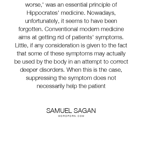 Primum non nocere, 'First, don't make things worse,' was an essential principle of Hippocrates' medicine. Nowadays, unfortunately, it seems to have been forgotten. Conventional modern medicine aims at getting rid of patients' symptoms. Little, if any consideration is given to the fact that some of these symptoms may actually be used by the body in an attempt to correct deeper disorders. When this is the case, suppressing the symptom does not necessarily help the patient