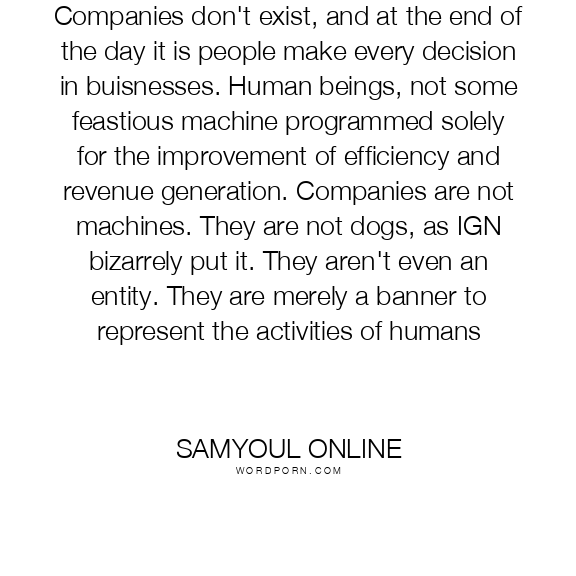 Companies don't exist, and at the end of the day it is people make every decision in buisnesses. Human beings, not some feastious machine programmed solely for the improvement of efficiency and revenue generation. Companies are not machines. They are not dogs, as IGN bizarrely put it. They aren't even an entity. They are merely a banner to represent the activities of humans
