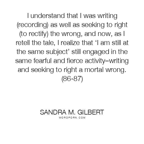 I understand that I was writing (recording) as well as seeking to right (to rectify) the wrong, and now, as I retell the tale, I realize that ‘I am still at the same subject’ still engaged in the same fearful and fierce activity–writing and seeking to right a mortal wrong. (86-87)