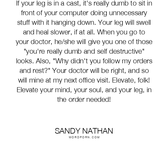If your leg is in a cast, it's really dumb to sit in front of your computer doing unnecessary stuff with it hanging down. Your leg will swell and heal slower, if at all. When you go to your doctor, he/she will give you one of those "you're really dumb and self destructive" looks. Also, "Why didn't you follow my orders and rest?" Your doctor will be right, and so will mine at my next office visit. Elevate, folk! Elevate your mind, your soul, and your leg, in the order needed!