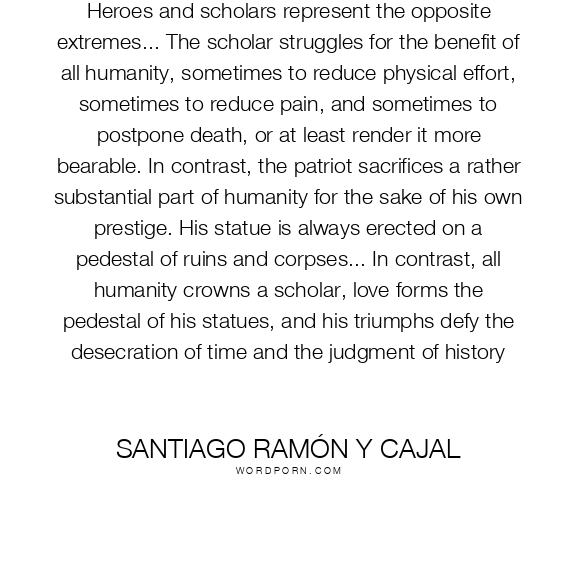 Heroes and scholars represent the opposite extremes... The scholar struggles for the benefit of all humanity, sometimes to reduce physical effort, sometimes to reduce pain, and sometimes to postpone death, or at least render it more bearable. In contrast, the patriot sacrifices a rather substantial part of humanity for the sake of his own prestige. His statue is always erected on a pedestal of ruins and corpses... In contrast, all humanity crowns a scholar, love forms the pedestal of his statues, and his triumphs defy the desecration of time and the judgment of history