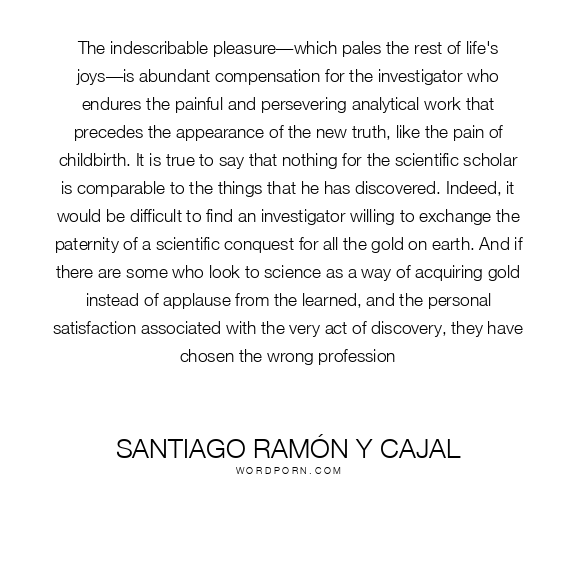 The indescribable pleasure—which pales the rest of life's joys—is abundant compensation for the investigator who endures the painful and persevering analytical work that precedes the appearance of the new truth, like the pain of childbirth. It is true to say that nothing for the scientific scholar is comparable to the things that he has discovered. Indeed, it would be difficult to find an investigator willing to exchange the paternity of a scientific conquest for all the gold on earth. And if there are some who look to science as a way of acquiring gold instead of applause from the learned, and the personal satisfaction associated with the very act of discovery, they have chosen the wrong profession