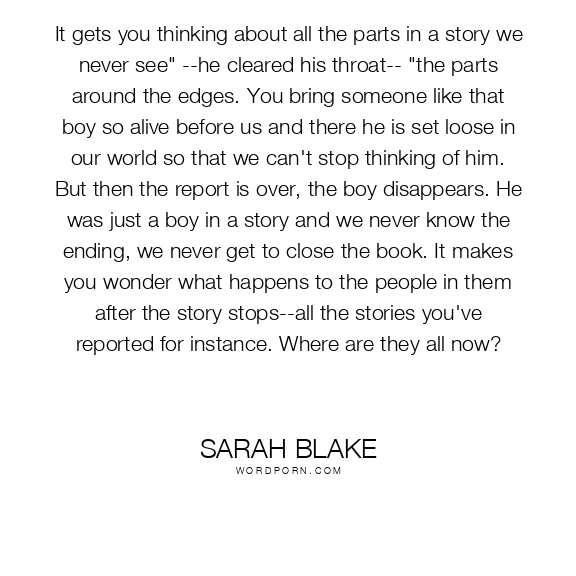 It gets you thinking about all the parts in a story we never see" --he cleared his throat-- "the parts around the edges. You bring someone like that boy so alive before us and there he is set loose in our world so that we can't stop thinking of him. But then the report is over, the boy disappears. He was just a boy in a story and we never know the ending, we never get to close the book. It makes you wonder what happens to the people in them after the story stops--all the stories you've reported for instance. Where are they all now?