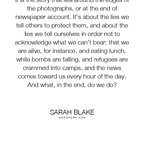 It is the story that lies around the edges of the photographs, or at the end of newspaper account. It's about the lies we tell others to protect them, and about the lies we tell ourselves in order not to acknowledge what we can't bear: that we are alive, for instance, and eating lunch, while bombs are falling, and refugees are crammed into camps, and the news comes toward us every hour of the day. And what, in the end, do we do?