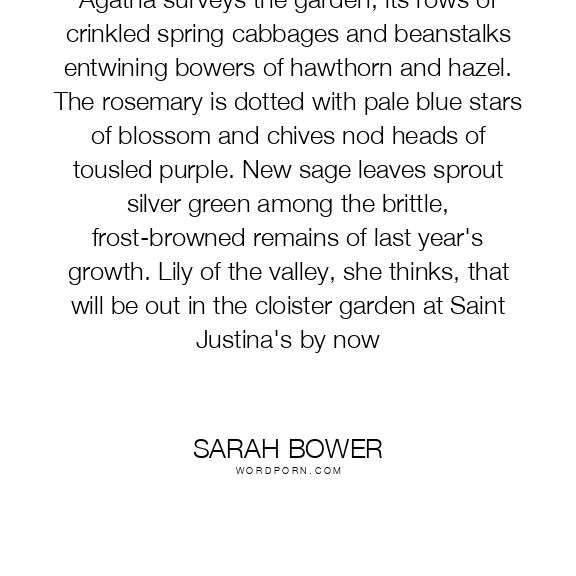 Agatha surveys the garden, its rows of crinkled spring cabbages and beanstalks entwining bowers of hawthorn and hazel. The rosemary is dotted with pale blue stars of blossom and chives nod heads of tousled purple. New sage leaves sprout silver green among the brittle, frost-browned remains of last year's growth. Lily of the valley, she thinks, that will be out in the cloister garden at Saint Justina's by now