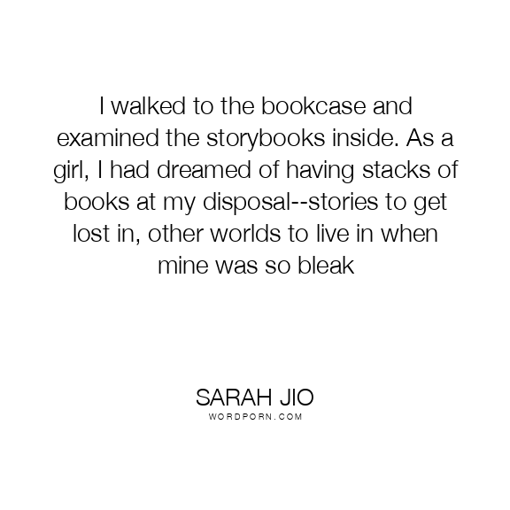 I walked to the bookcase and examined the storybooks inside. As a girl, I had dreamed of having stacks of books at my disposal--stories to get lost in, other worlds to live in when mine was so bleak