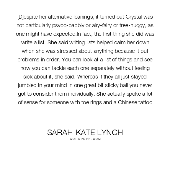 [D]espite her alternative leanings, it turned out Crystal was not particularly psyco-babbly or airy-fairy or tree-huggy, as one might have expected.In fact, the first thing she did was write a list. She said writing lists helped calm her down when she was stressed about anything because it put problems in order. You can look at a list of things and see how you can tackle each one separately without feeling sick about it, she said. Whereas if they all just stayed jumbled in your mind in one great bit sticky ball you never got to consider them individually. She actually spoke a lot of sense for someone with toe rings and a Chinese tattoo