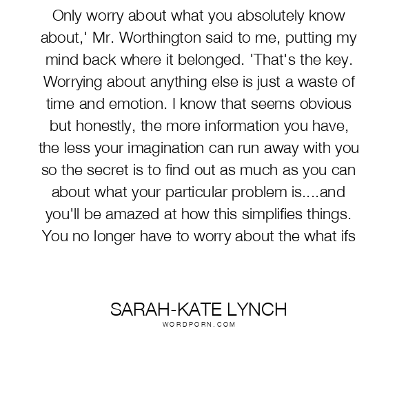 Only worry about what you absolutely know about,' Mr. Worthington said to me, putting my mind back where it belonged. 'That's the key. Worrying about anything else is just a waste of time and emotion. I know that seems obvious but honestly, the more information you have, the less your imagination can run away with you so the secret is to find out as much as you can about what your particular problem is....and you'll be amazed at how this simplifies things. You no longer have to worry about the what ifs