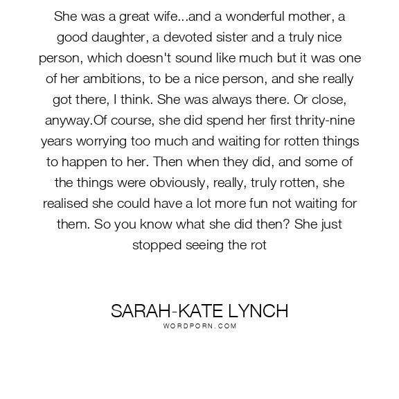 She was a great wife...and a wonderful mother, a good daughter, a devoted sister and a truly nice person, which doesn't sound like much but it was one of her ambitions, to be a nice person, and she really got there, I think. She was always there. Or close, anyway.Of course, she did spend her first thrity-nine years worrying too much and waiting for rotten things to happen to her. Then when they did, and some of the things were obviously, really, truly rotten, she realised she could have a lot more fun not waiting for them. So you know what she did then? She just stopped seeing the rot