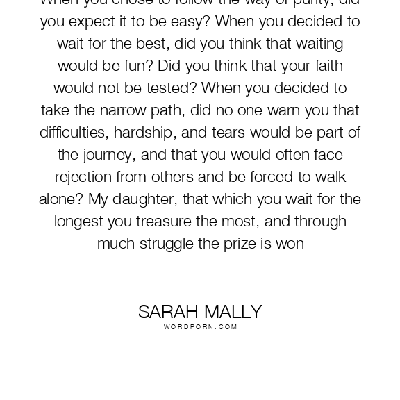 When you chose to follow the way of purity, did you expect it to be easy? When you decided to wait for the best, did you think that waiting would be fun? Did you think that your faith would not be tested? When you decided to take the narrow path, did no one warn you that difficulties, hardship, and tears would be part of the journey, and that you would often face rejection from others and be forced to walk alone? My daughter, that which you wait for the longest you treasure the most, and through much struggle the prize is won