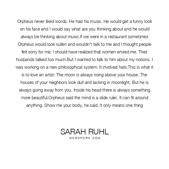 Orpheus never liked words. He had his music. He would get a funny look on his face and I would say what are you thinking about and he would always be thinking about music.If we were in a restaurant sometimes Orpheus would look sullen and wouldn't talk to me and I thought people felt sorry for me. I should have realized that women envied me. Their husbands talked too much.But I wanted to talk to him about my notions. I was working on a new philosophical system. It involved hats.This is what it is to love an artist: The moon is always rising above your house. The houses of your neighbors look dull and lacking in moonlight. But he is always going away from you. Inside his head there is always something more beautiful.Orpheus said the mind is a slide ruler. It can fit around anything. Show me your body, he said. It only means one thing