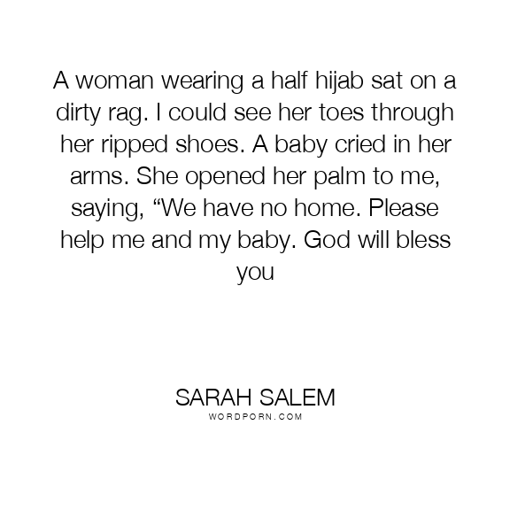 A woman wearing a half hijab sat on a dirty rag. I could see her toes through her ripped shoes. A baby cried in her arms. She opened her palm to me, saying, “We have no home. Please help me and my baby. God will bless you