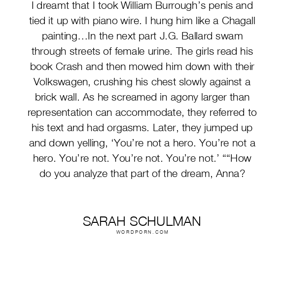 I dreamt that I took William Burrough’s penis and tied it up with piano wire. I hung him like a Chagall painting…In the next part J.G. Ballard swam through streets of female urine. The girls read his book Crash and then mowed him down with their Volkswagen, crushing his chest slowly against a brick wall. As he screamed in agony larger than representation can accommodate, they referred to his text and had orgasms. Later, they jumped up and down yelling, ‘You’re not a hero. You’re not a hero. You’re not. You’re not. You’re not.’ ““How do you analyze that part of the dream, Anna?