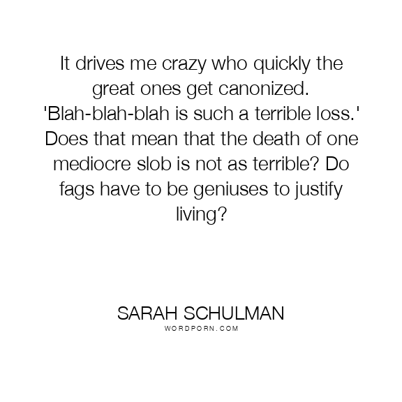 It drives me crazy who quickly the great ones get canonized. 'Blah-blah-blah is such a terrible loss.' Does that mean that the death of one mediocre slob is not as terrible? Do fags have to be geniuses to justify living?
