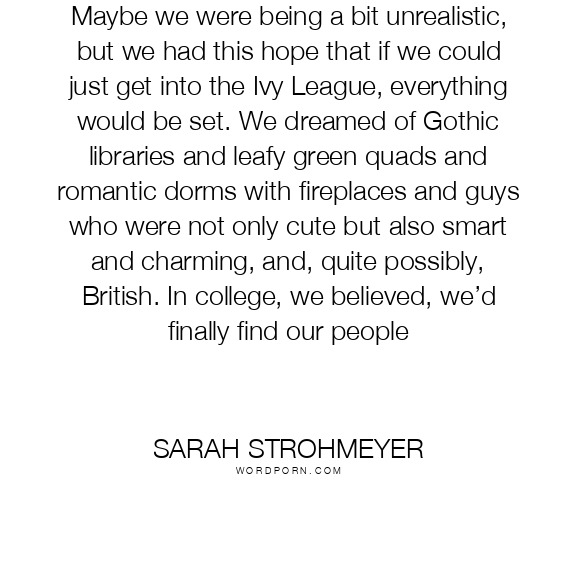 Maybe we were being a bit unrealistic, but we had this hope that if we could just get into the Ivy League, everything would be set. We dreamed of Gothic libraries and leafy green quads and romantic dorms with fireplaces and guys who were not only cute but also smart and charming, and, quite possibly, British. In college, we believed, we’d finally find our people