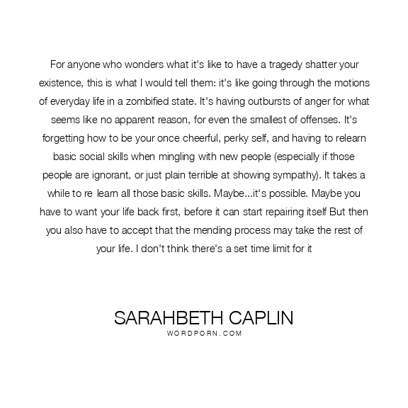 For anyone who wonders what it's like to have a tragedy shatter your existence, this is what I would tell them: it's like going through the motions of everyday life in a zombified state. It's having outbursts of anger for what seems like no apparent reason, for even the smallest of offenses. It's forgetting how to be your once cheerful, perky self, and having to relearn basic social skills when mingling with new people (especially if those people are ignorant, or just plain terrible at showing sympathy). It takes a while to re-learn all those basic skills. Maybe...it's possible. Maybe you have to want your life back first, before it can start repairing itself But then you also have to accept that the mending process may take the rest of your life. I don't think there's a set time limit for it