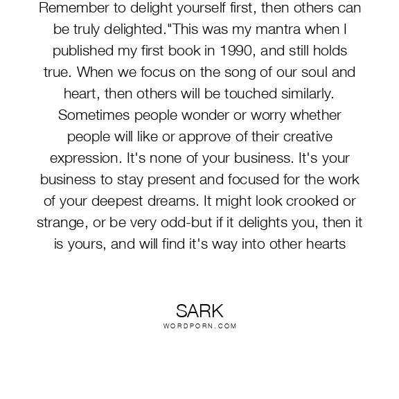 Remember to delight yourself first, then others can be truly delighted."This was my mantra when I published my first book in 1990, and still holds true. When we focus on the song of our soul and heart, then others will be touched similarly. Sometimes people wonder or worry whether people will like or approve of their creative expression. It's none of your business. It's your business to stay present and focused for the work of your deepest dreams. It might look crooked or strange, or be very odd-but if it delights you, then it is yours, and will find it's way into other hearts