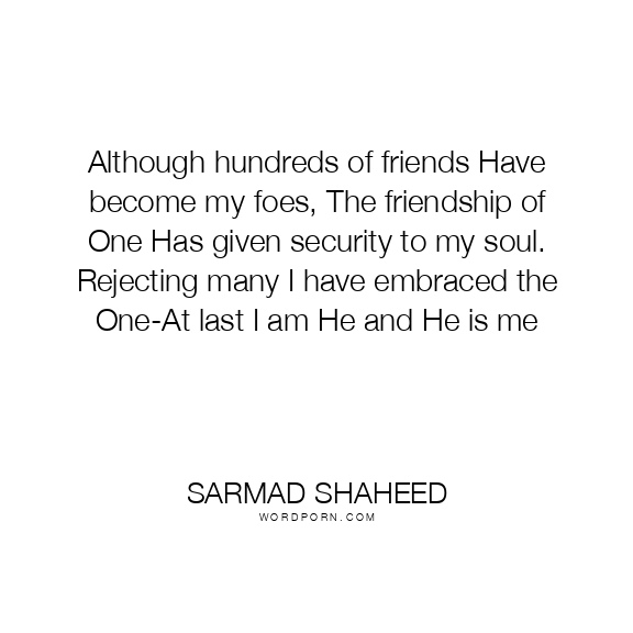 Although hundreds of friends Have become my foes, The friendship of One Has given security to my soul. Rejecting many I have embraced the One-At last I am He and He is me