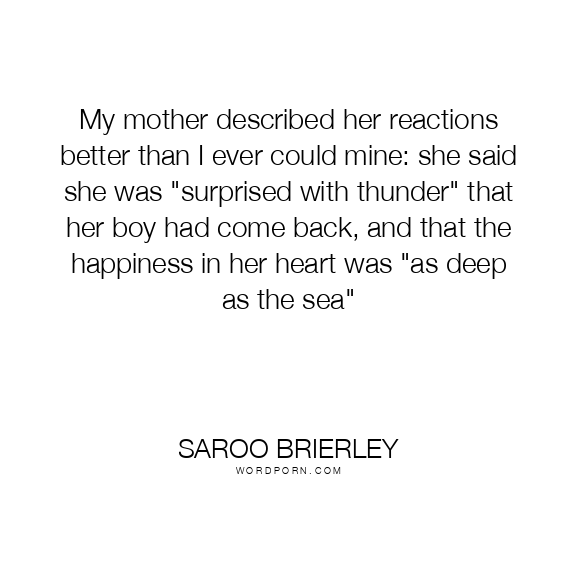 My mother described her reactions better than I ever could mine: she said she was "surprised with thunder" that her boy had come back, and that the happiness in her heart was "as deep as the sea"