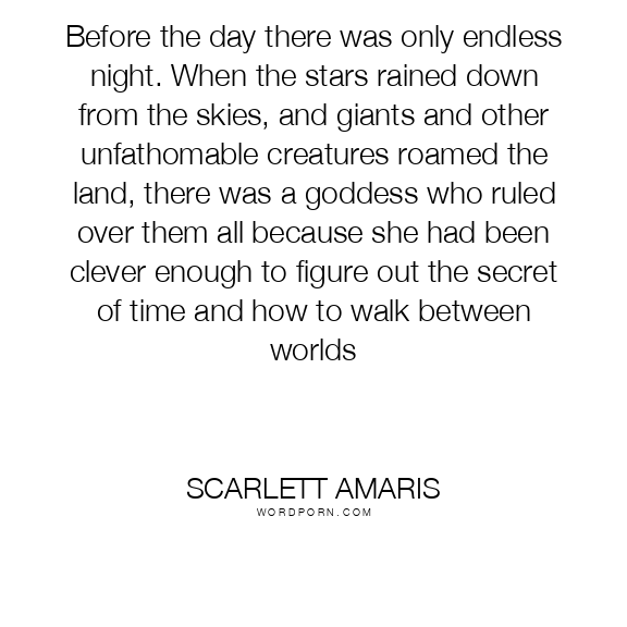 Before the day there was only endless night. When the stars rained down from the skies, and giants and other unfathomable creatures roamed the land, there was a goddess who ruled over them all because she had been clever enough to figure out the secret of time and how to walk between worlds
