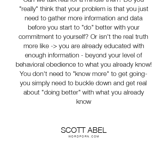 Can we talk real for a minute then? Do you "really" think that your problem is that you just need to gather more information and data before you start to "do" better with your commitment to yourself? Or isn't the real truth more like -> you are already educated with enough information - beyond your level of behavioral obedience to what you already know! You don't need to "know more" to get going- you simply need to buckle down and get real about "doing better" with what you already know